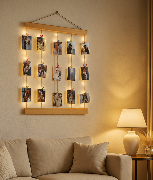 Pêle-mêle mural en bois avec cordes – Support photos décoratif (50 × 70 cm)